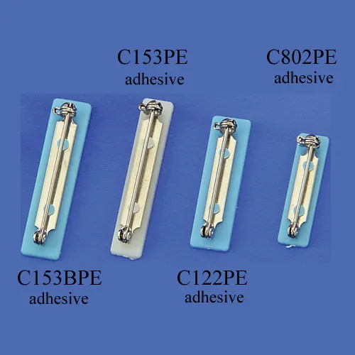 Adhesive Pin Clip Name Tag or ID Holders with Safety LocksSafety pin name tag holder or ID holder comes with adhesive tape on the back of metal pin clips. At the end of pin clip has an easy to open and close lock with safety end. The safety pin has blue pad or white pad to attach on. The adhesive tape can be peeled and ticked on your name tag or laminated ID holder easily.