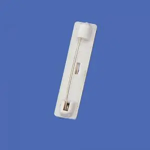 PLASTIC BADGE PIN - Pressure-Sensitive Adhesive Bar Pin in all-white plastic with safety pin, oval base, high-bond adhesive pads.Safety name tag pincome with adhesive tape on the back. It is great for smaller size of name tags, ID cards or ID holders.. At the end of pin clip has a plastic cover round hole to protect the pin from hurting your finger. The adhesive tape can be peeled and stick onto your name tag, ID card or laminated ID holder easily.