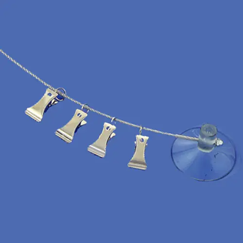 This Photo/Memo Clip Cable System can hang a favorite photo, notes or perhaps a to-do list. Extend the cable out and stick the suction cups onto any dry, non-porous surface. Then use the clips to complete the job! Note that the cable is meant to hang lightweight items. Comes in six different styles.