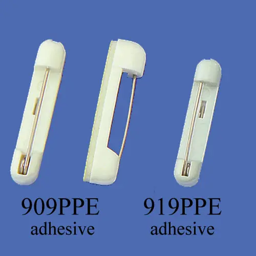 PLASTIC BADGE PIN - Pressure-Sensitive Adhesive Bar Pin in all-white plastic with safety pin, oval base, high-bond adhesive pads.Safety name tag pincome with adhesive tape on the back. It is great for smaller size of name tags, ID cards or ID holders.. At the end of pin clip has a plastic cover round hole to protect the pin from hurting your finger. The adhesive tape can be peeled and stick onto your name tag, ID card or laminated ID holder easily.